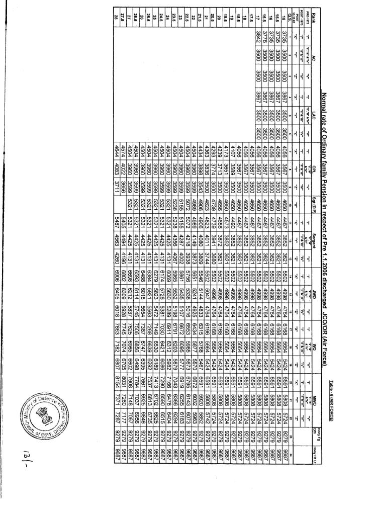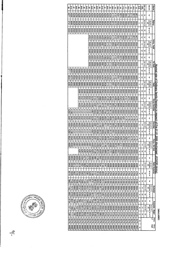 9. Keeping in view the above decision arid to quicken the process of revision of ordinary family pension, specific tables (total six tables) indicating revised rate of ordinary family pension payable from 24.09.2012 have been prepared for JCO/OR of Regular Army, Navy. Air Force and DSC who were discharged/invalided out/died in service prior to 1.1.2006 and are enclosed as Appendix to this letter. PDAs will revise and pay the ordinary family pension with reference to applicable Table for the rank and group in which the JCO/OR was pensioned with reference to the actual qualifying service as shown in Column-I In cases where ordinary family pension of an pre-2006 JCO/OR pensioner had not been commenced as the pensioner was alive on 24.09.2012, the rate of revised ordinary family pension shall be payable by the PDAs from the date following the death of the pensioner at appropriate rate.