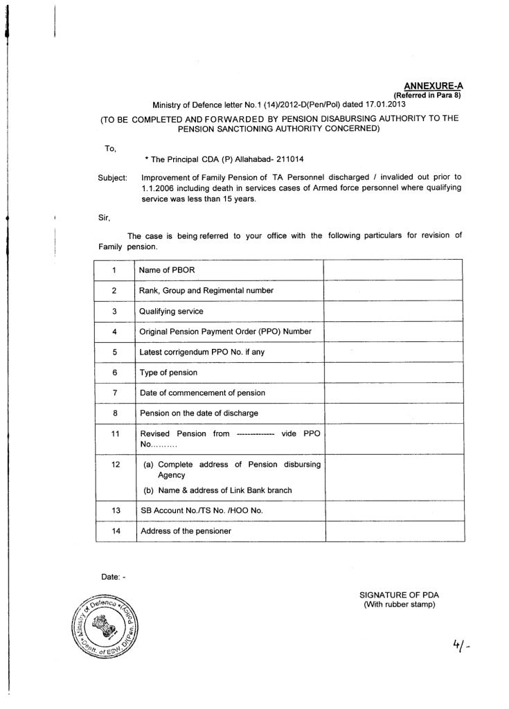8, All Pension disbursing Agencies (PDAs) handling disbursement of pension to Defence pensioners are hereby authorized to carry out revision of Ordinary Family pension in respect of pre-2006 JCO/OR family pensioners drawing ordinary family pension as on 24.09.2012 in terms of these orders without calling for any applications from the family pensioner and without any further authorization from the concerned Pension Sanctioning Authorities (PSAs). Revision of Ordinary Family pension in respect of TA personnel and also in death in service cases where qualifying service is less than 15 years shall, however, be referred to the respective Pension Sanctioning Authorities (PSA) on Annexure-A attached to this letter for issue of corrigendum PPO.