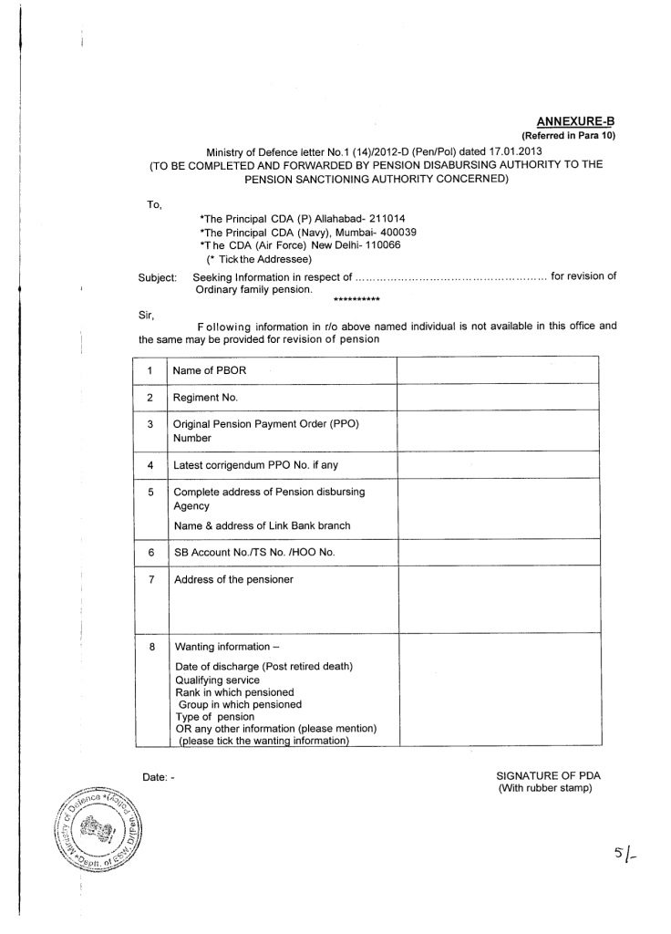 10. The initial Pension Payment Order (PPO) in respect of JCO/OR, its Corrigendum (PPO) indicates rank, group and qualifying service for which the individual has been pensioned. These information are available with PDAs as they have revised pension of all such pensioners in the recent past in terms of Government orders issued on the recommendations of Sixth CPC and Cabinet Secretary Committee (2009). In case, however, any information regarding qualifying service, rank, group etc., is not available with Pension Disbursing Agencies, such cases may be referred to PSAs concerned on the proforma enclosed as Annexure-B. The PSAs will provide the requisite information from the available records.