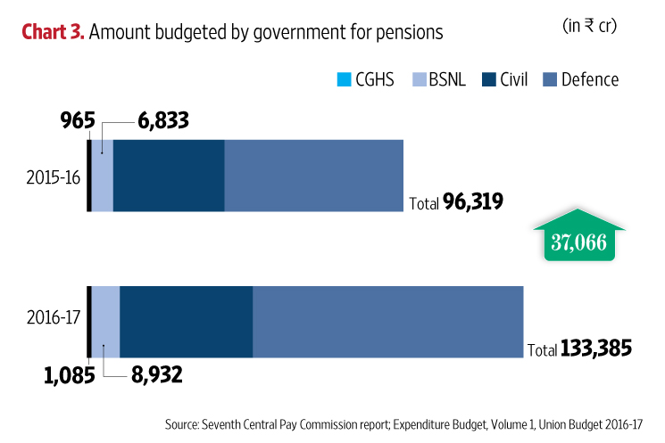 The second place to look for is pensions, the details of which are again provided under non-plan expenditure. This shows the government has budgeted for an increase of Rs.37,066 crore.