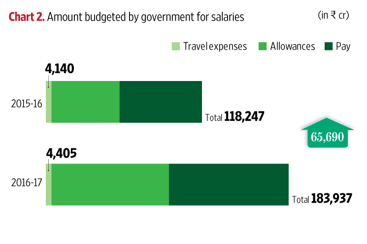 The first place to look for is under non-plan expenditure, and a table titled “Estimated strength of establishment and provision thereof”. This details how many employees are there in 56 government departments (excluding defence) and how much the government has budgeted to pay their salaries: an increase ofRs.65,690 crore in 2016-17. Thus, we have accounted for around 65% of SPC’s impact.