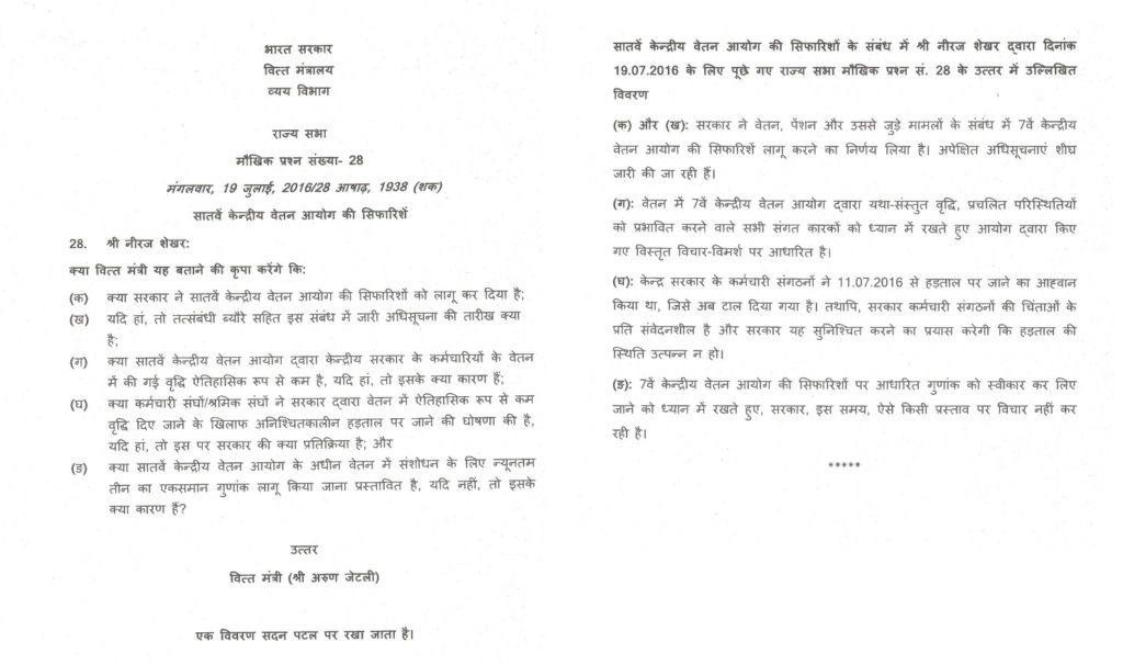7th Pay Commission multiplication factor – Government has no proposal to increase it to 3 at present – Finance Ministry replied a Starred Question in Rajya Sabha