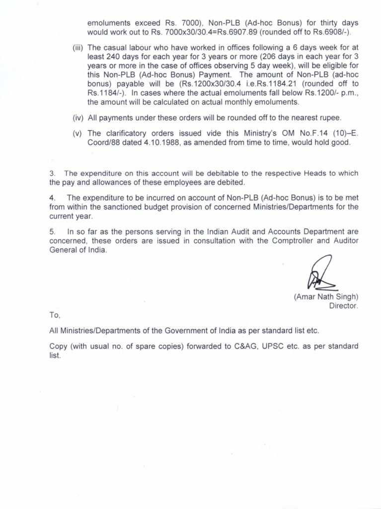 (iii) The casual labour who have worked in offices following a 6 days week for at least 240 days for each year for 3 years or more (206 days in each year for 3 years or more in the case of offices observing 5 day week), will be eligible for this Non-PLB (Ad-hoc Bonus) Payment. The amount of Non-PLB (ad-hoc bonus) payable will be (Rs.120ox30/30.4 i.e.Rs.1184.21 (rounded off to Rs.1184/-). In cases where the actual emoluments fall below Rs.1200/- pm, the amount will be calculated on actual monthly emoluments.
