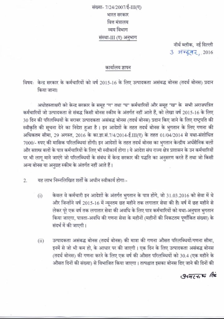 Bonus Order 2016: Grant of Non-Productivity Linked Bonus (ad-hoc bonus) to Central Government Employees for the year 2015-16.