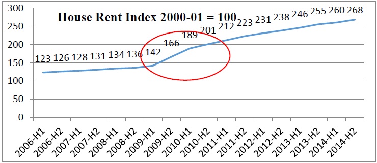 8.7.14 The Commission also took note of the link between increase in HRA and increase in house rent. There was a sharp rise in the index from the first