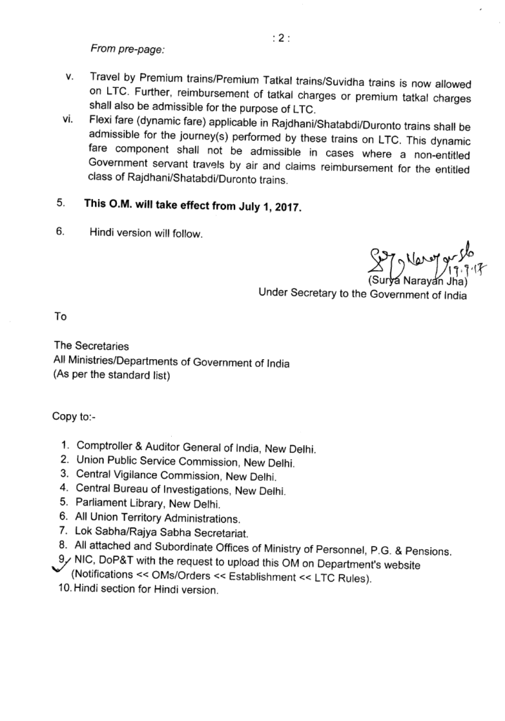 7th CPC Travel Entitlement on Leave Travel Concession w.e.f. 1st July, 2017: DoPT OM 19.09.2017