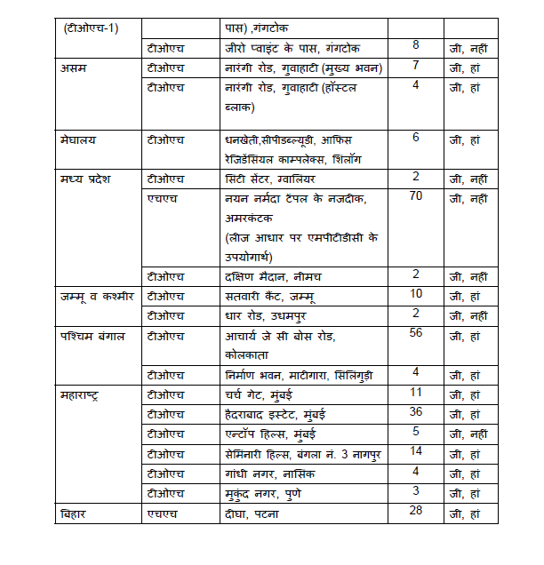 | Meghalaya | TOH | Dhankheti, CPWD, OfficeResidential ComplexShillong | 6 | Yes |