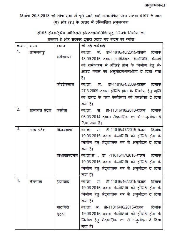 | Yadagiri Gutta | In-principle approval has been conveyed for construction of Holiday Home to CPWD vide OM No. D-11016/46/2015- Regions dated 19.06.2015 |