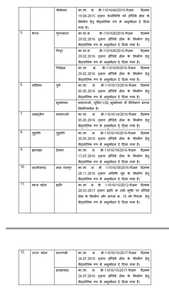 | 12 | Uttar Pradesh | Varanasi | In-principle approval has been conveyed for construction of Holiday Homes vide OM No. D-11016/15/2017-Regions dated 24.07.2016 |