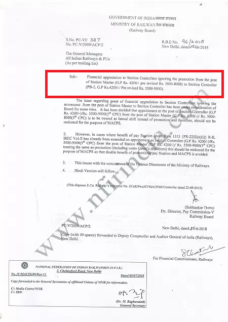 The issue regarding grant of financial upgradation to Section Controllers ignoring the movement from the post of Station Master to Section Controller has been consideration of Board for some time. It has been decided that appointment to the post of Section Controller (G.P Rs. 4200/-)/Rs. 5500-9000(5th CPC) from the post of Station Master (G.P Rs.4200/-)/ Rs. 5000-8000 (5th CPC) is to be treated as lateral shift instead of promotion and therefore, should not be reckoned for the purpose of MACPS.