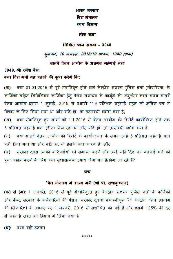 7th CPC Pension Formula: Dearness Relief taking into account for [LokSabha QA]