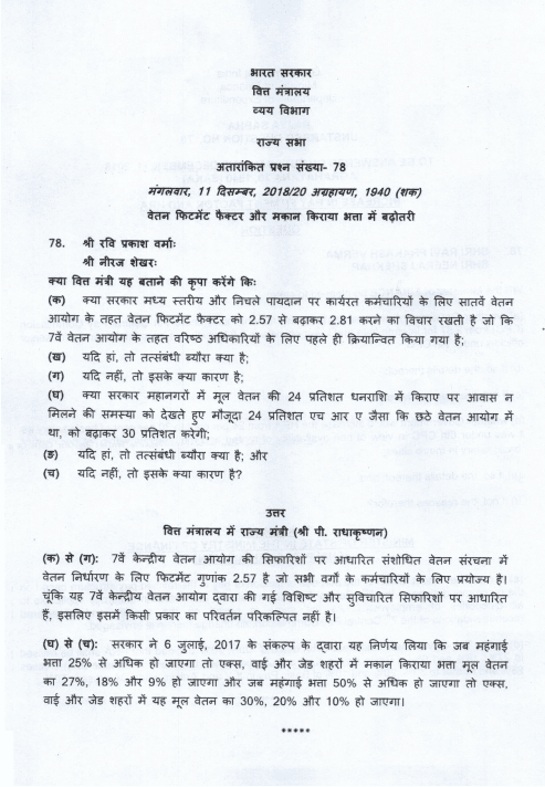 चुनावी वर्ष में वर्तमान एनडीए सरकार से सातवें वेतन आयोग के अनुशंसाओं में सुधार का इंतजार कर रहे केन्द्रीय कर्मचारियों के लिए यह अच्छी खबर नहीं है. कर्मचारियों की उम्मीदों पर फिर पानी फेरते हुए राज्यसभा में एक प्रश्न के उत्तर में वित्त राज्यमंत्री श्री पी.राधाकृष्णन ने संसद को बताया कि 2.57 का फिटमैंट फैक्टर और हाउस रेंट एलाउंस की वतर्मान प्रतिशतता 7वें केन्द्रीय वेतन आयोग द्वारा की गई विशिष्ट और सुविचारित सिफारिशों पर आधारित है, इसलिए इसमें किसी प्रकार का परिवर्तन परिकल्पित नहीं है.