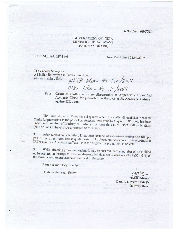 Grant of another one time dispensation to Appendix -II qualified Accounts Clerks for promotion to the post of Jr. Accounts Assistant against DR quota