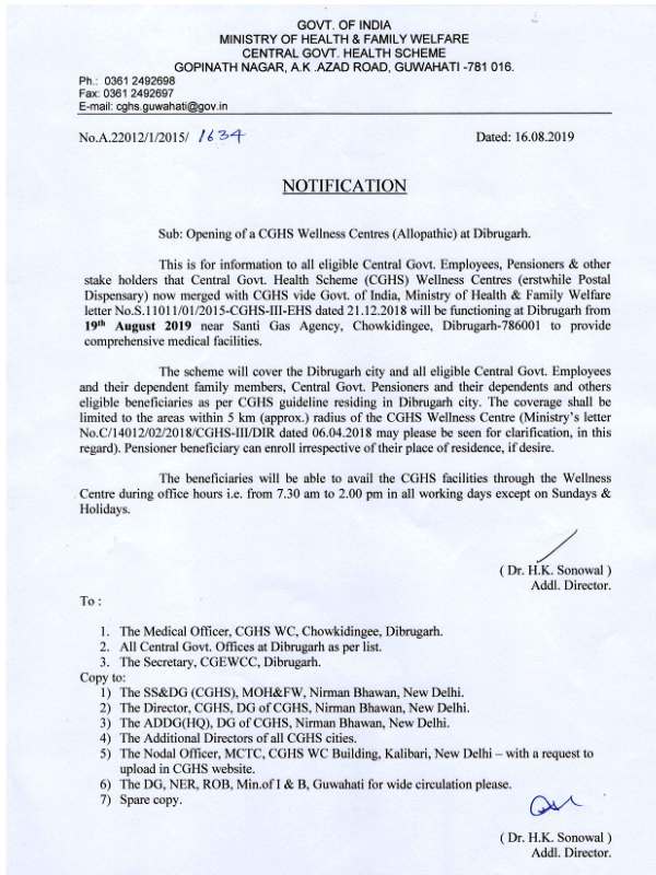 This is for information to all eligible Central Govt. Employees, Pensioners & other stake holders that Central Govt. Health Scheme (CGHS) Wellness Centres (erstwhile Postal Dispensary) now merged with CGHS vide Govt. of India, Ministry of Health & Family Welfare letter No.S.11011/01/2015-CGHS-III-EHS dated 21.12.2018 will be functioning at Dibrugarh from 19th August 2019 near Santi Gas Agency, Chowkidingee , Dibrugarh-786001 to provide comprehensive medical facilities.