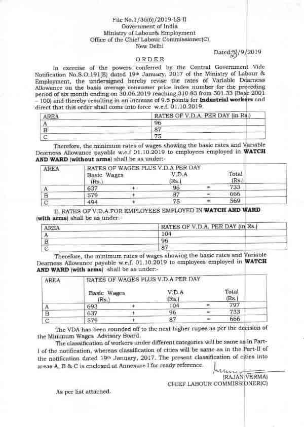 In exercise of the powers conferred by the Central Government Vide Notification No.S.0 . 19l(E) dated 19th January, 2017 of the Ministry of Labour & Employment, the undersigned hereby revise the rates of Variable Dearness Allowance on the basis average consumer price index number for the preceding period of six month ending on 30.06.2019 reaching 310.83 from 301.33 (Base 2001 – 100) and thereby resulting in an increase of 9.5 points for Industrial workers and direct that this order shall come into force w.e.f. 01.10.2019.