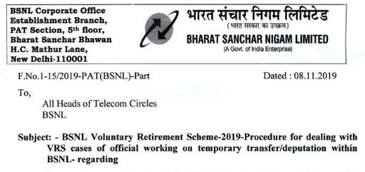 Consequent upon notification of the BSNL Voluntary Retirement Scheme-2019 and circulation of guidelines vide this office letter of even number dated 04.11.2019, several queries have been received by this office regarding procedure to be followed for dealing with VRS request of eligible officials of different cadres working on temporary transfer/deputation basis in offices outside their parent Circle/SSN Division in BSNL. Procedure to be followed in such cases will be as under: