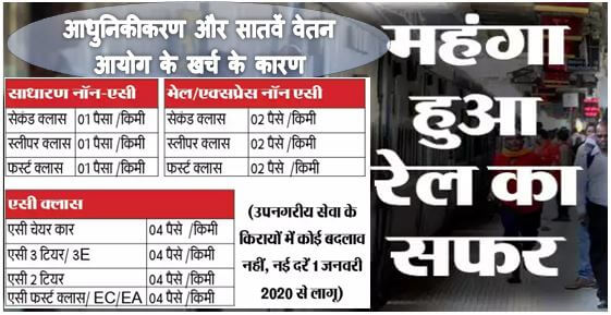 रेलवे ने यात्री किराये में बढ़ोतरी कर दी है। जनरल से एसी से क्लास तक का सफर महंगा हो गया है। प्रति किलोमीटर 01 से 04 पैसे तक की वृद्धि की गई है। इससे यात्रियों को पहले की तुलना में अब ज्यादा किराया चुकाना होगा, जिसका लंबी दूरी की यात्रा करने वाले यात्रियों पर अधिक असर होगा। किराये की बढ़ी हुई दरें 1 जनवरी, 2020 से लागू हो जाएंगी