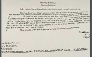 2. In view of the directions of the Hon’ble Supreme Court, PCDA(P), Allahabad may be advised to issue a Circular to the Pension Disbursing Agencies not to make recovery of the Income Tax on disability pension as per CBDT circular No. 13 dated 24th June 2019 disseminated to the PDAs vide PCDA(P) Circular No. 210 No. 210 No. At/Tech/228/Vol.IX dated 20.02.2020. till a final decision is taken by the Hon’ble Supreme Court in the matter.