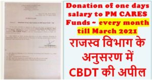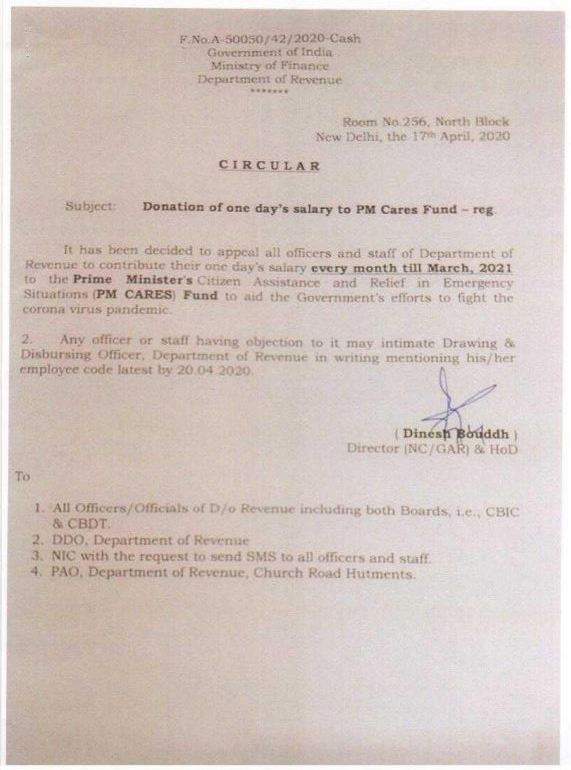 It has been decided to appeal all officers/ staff of Department of Revenue to contribute their one day’s salary every month till March. 2021 to PM’s CARES FUND to aid the Government’s efforts to fight the corona virus pandemic vide F.No.A-50050/42/2020-Cash dated 14.04.2020.