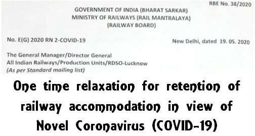 RBE No. 38/2020 on Railway Accommodation: One time relaxation for retention in view of Novel Coronavirus (COVID-19)