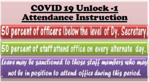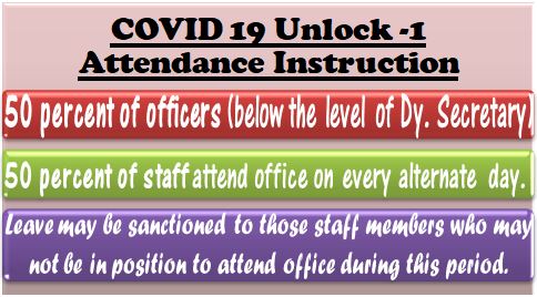 COVID 19 Unlock 1 period attendance : 50 percent staff to attend office and leave to be sanctioned on not attending office