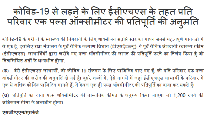 As measuring of oxygen saturation level is one of the most important parameters for monitoring the health of COVID-19 patients, Ministry of Defence (MoD), Department of Ex-Servicemen Welfare (DSEW) has decided to reimburse the cost of pulse oximeter purchased by the Ex-Servicemen Contributory Health Scheme (ECHS) beneficiaries subject to the following conditions: