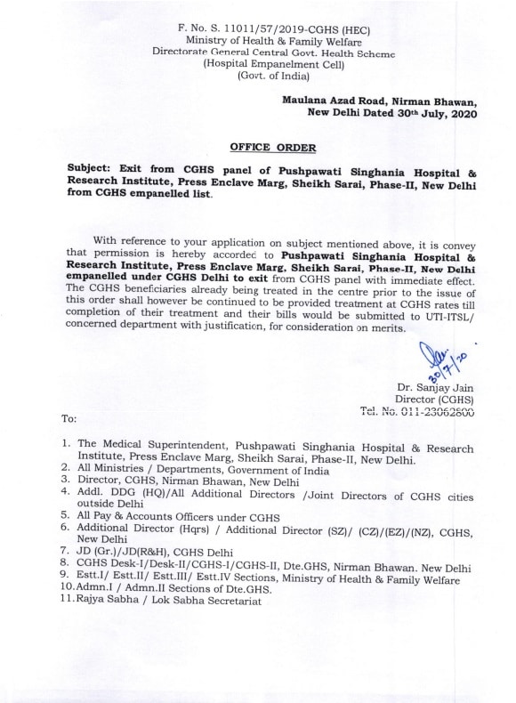 De-empanelment of Pushpawati Singhania Hospital and Research Institute, New Delhi from CGHS (30 July 2020)