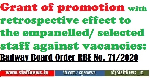 Grant of promotion with retrospective effect to the empanelled/ selected staff against vacancies: Railway Board Order RBE No. 71/2020