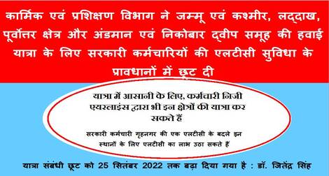 एलटीसी सुविधा के प्रावधानों में छूट: जम्मू एवं कश्मीर, लद्दाख, पूर्वोत्तर क्षेत्र और अंडमान एवं निकोबार द्वीप समूह की हवाई यात्रा के लिए 25 सितंबर 2022 तक छूट