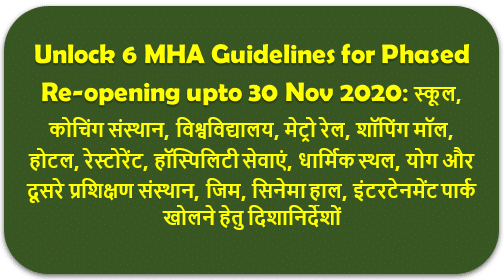 Unlock 6 MHA Guidelines for Phased Re-opening upto 30 Nov 2020: स्कूल, कोचिंग संस्थान, विश्वविद्यालय, मेट्रो रेल, शॉपिंग मॉल, होटल, रेस्टोरेंट, हॉस्पिलिटी सेवाएं, धार्मिक स्थल, योग और दूसरे प्रशिक्षण संस्थान, जिम, सिनेमा हाल, इंटरटेनमेंट पार्क खोलने हेतु दिशानिर्देशों
