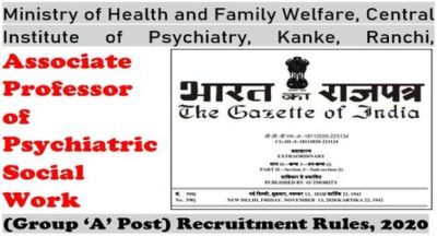 Associate Professor of Psychiatric Social Work (Group ‘A’ Post) Recruitment Rules, 2020 – Ministry of Health and Family Welfare, Central Institute of Psychiatry, Kanke, Ranchi