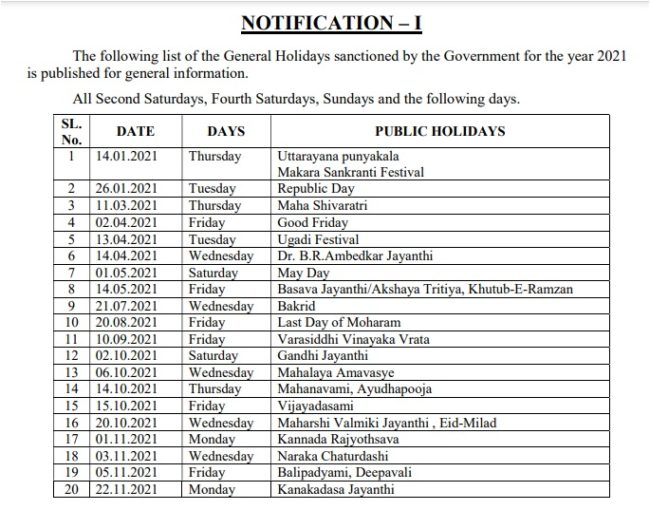 1. This list does not include Mahaveera Jayanthi (25.04.2021) and Independence day – (15.08.2021) which falls on Sundays & Christmas (25.12.2021) which falls on Fourth Saturday.