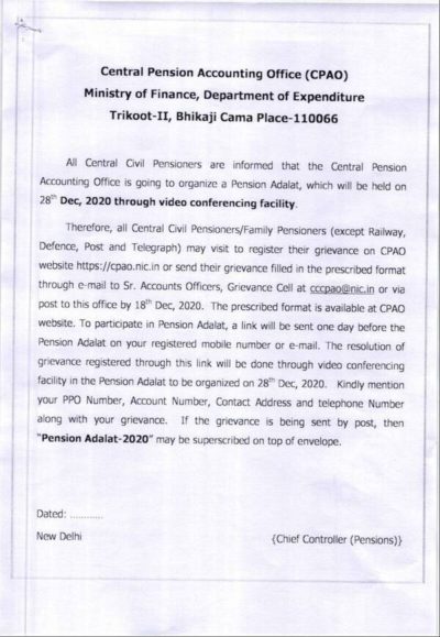 All Central Civil Pensioners are informed that the Central Pension Accounting Office is going to organize a Pension Adalat, which will be held on 28th Dec, 2020 through video conferencing facility.