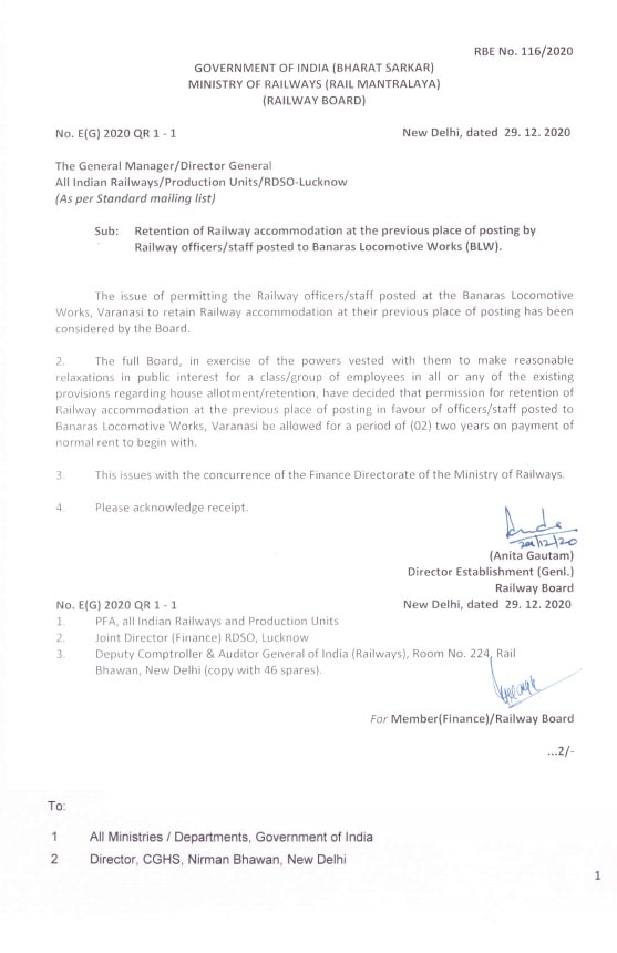 Retention of Railway accommodation at the previous place of posting by Railway officers/staff posted to Banaras Locomotive Works (BLW): Railway Board RBE No. 116/2020