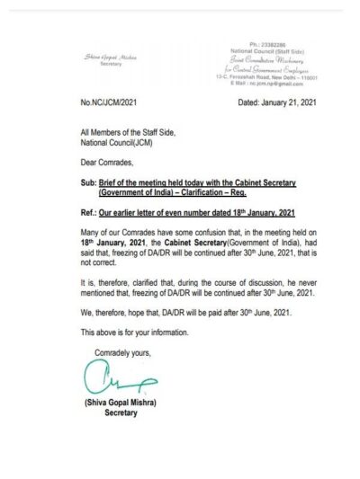 Many of our Comrades have some confusion that, in the meeting held on 18th January, 2021, the Cabinet Secretary(Government of India), had said that, freezing of DA/DR will be continued after 30th June, 2021, that is not correct.