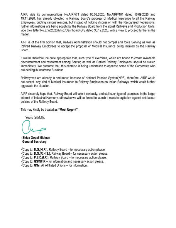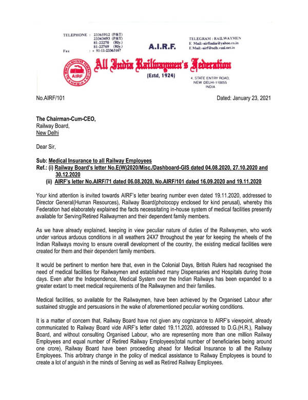 AIRF, vide its communications No.AIRF/71 dated 06.08.2020, No.AIRF/101 dated 16.09.2020 and 19.11.2020, has already objected to Railway Board’s proposal of Medical Insurance to all the Railway Employees, quoting various reasons, but instead of holding discussion with the Recognised Federations, further informations are being sought by the Railway Board from the Zonal Railways and Production Units, vide their letter No.E(W)2020/Misc./Dashboard-GIS dated 30.12.2020, with a view to proceed further in the matter.