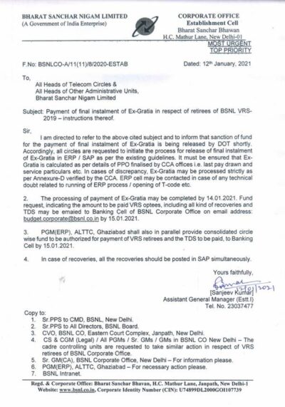 payment-of-final-instalment-of-ex-gratia-in-respect-of-retirees-of-bsnl-vrs-2019