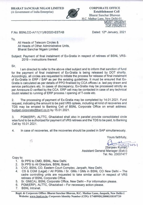 2. The processing of payment of Ex-Gratia may be completed by 14.01.2021. Fund request, indicating the amount to be paid VRS optees, including all kind of recoveries and TDS may be emailed to Banking Cell of BSNL Corporate Office on email address: budget.corporate[at]bsnl.co.in by 15.01.2021.