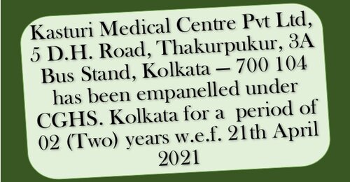 In pursuance of Ministry of Health & Family Welfare. New Delhi Guidelines — 2017 as available on the website of Ministry of Health & Family Welfare. New Delhi on the above mentioned subject (for Continuous Empanelment Scheme 2017) for empanelment of new Health Care Organizations (HCOs), it is hereby intimated that Kasturi Medical Centre Pvt Ltd, 5 D.H. Road, Thakurpukur, 3A Bus Stand, Kolkata — 700 104 has been empanelled under CGHS. Kolkata for a period of 02 (Two) years w.e.f. 21th April 2021 or till the validity of HCOs empanelled in 2014 & later on or till next empanelment whichever is earlier.