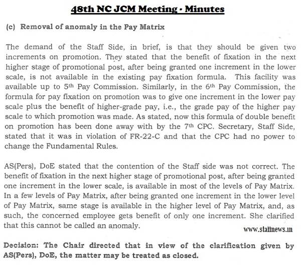 AS(Pers), DoE stated that the contention of the Staff side was not correct. The benefit of fixation in the next higher stage of promotional post, after being granted one increment in the lower scale, is available in most of the levels of Pay Matrix. In a few levels of Pay Matrix, after being granted one increment in the lower level of Pay Matrix, same stage is available in the higher level of Pay Matrix, and, as such, the concerned employee gets benefit of only one increment. She clarified that this cannot be called an anomaly.