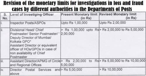 2 It has, therefore, been decided to revise the monetary limits for different postal authorities for conducting investigations and handing the loss/ fraud cases as under: