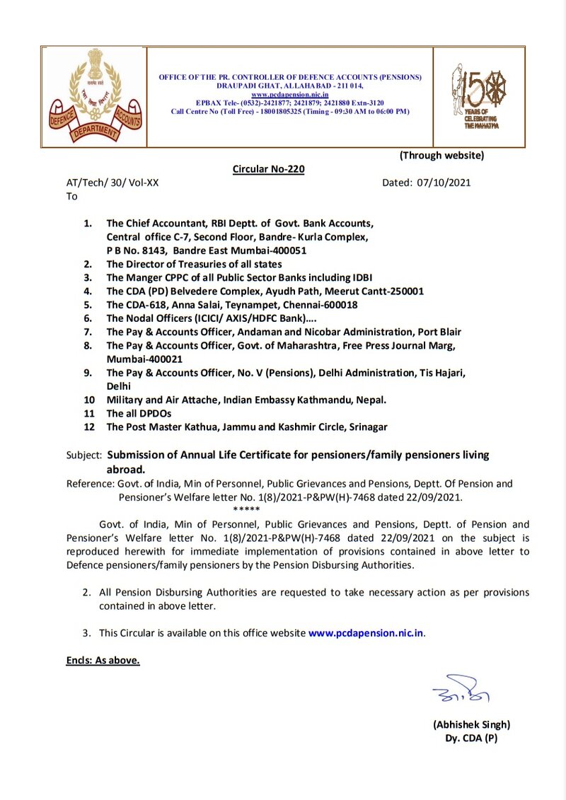 Submission of Annual Life Certificate for pensioners/ family pensioners living abroad: PCDA(P) Circular No. 220