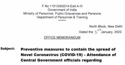 In view of the initial signs of surge in cases of COVID-19, the matter regulating attendance of Central Government employees has been reviewed and it has been decided as under, with immediate effect till 31st January, 2022.