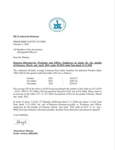 In terms of clause 7 of the 11th Bipartite Settlement dated 11.11.2020 and clause 3 of the Joint Note dated 11.11.2020, the rate of Dearness Allowance payable to Workmen and Officer employees for the months of February, March and April 2022 shall be 32.97 % of `pay’. While arriving at dearness allowance payable, decimals from third place may please be ignored.