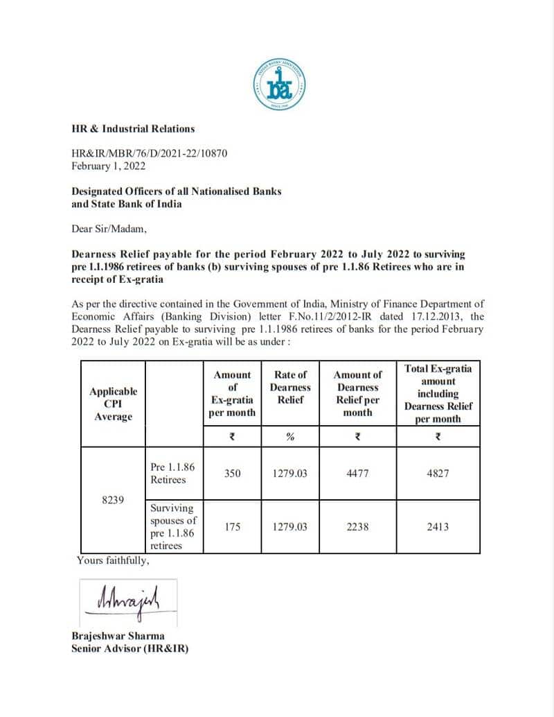 As per the directive contained in the Government of India, Ministry of Finance Department of Economic Affairs (Banking Division) letter F.No.11/2/2012-IR dated 17.12.2013, the Dearness Relief payable to surviving pre 1.1.1986 retirees of banks for the period February 2022 to July 2022 on Ex-gratia will be as under :