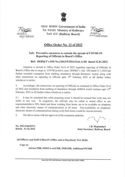 Reporting of Officials in Board’s Office upto 15th February 2022: Railway Board OO No. 12 of 2022