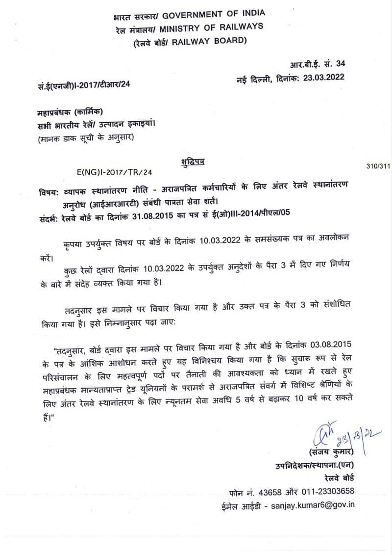 Comprehensive Transfer Policy — eligibility service condition for Non-Gazetted Employees on Inter-Railway Request Transfer (IRRT): Corrigendum RBE No. 34/2022