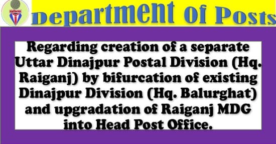 Creation of a separate Uttar Dinajpur Postal Division (Hq. Raiganj) by bifurcation of existing Dinajpur Division (Hq. Balurghat) and upgradation of Raiganj MDG into Head Post Office.– order dated 26.04.2022
