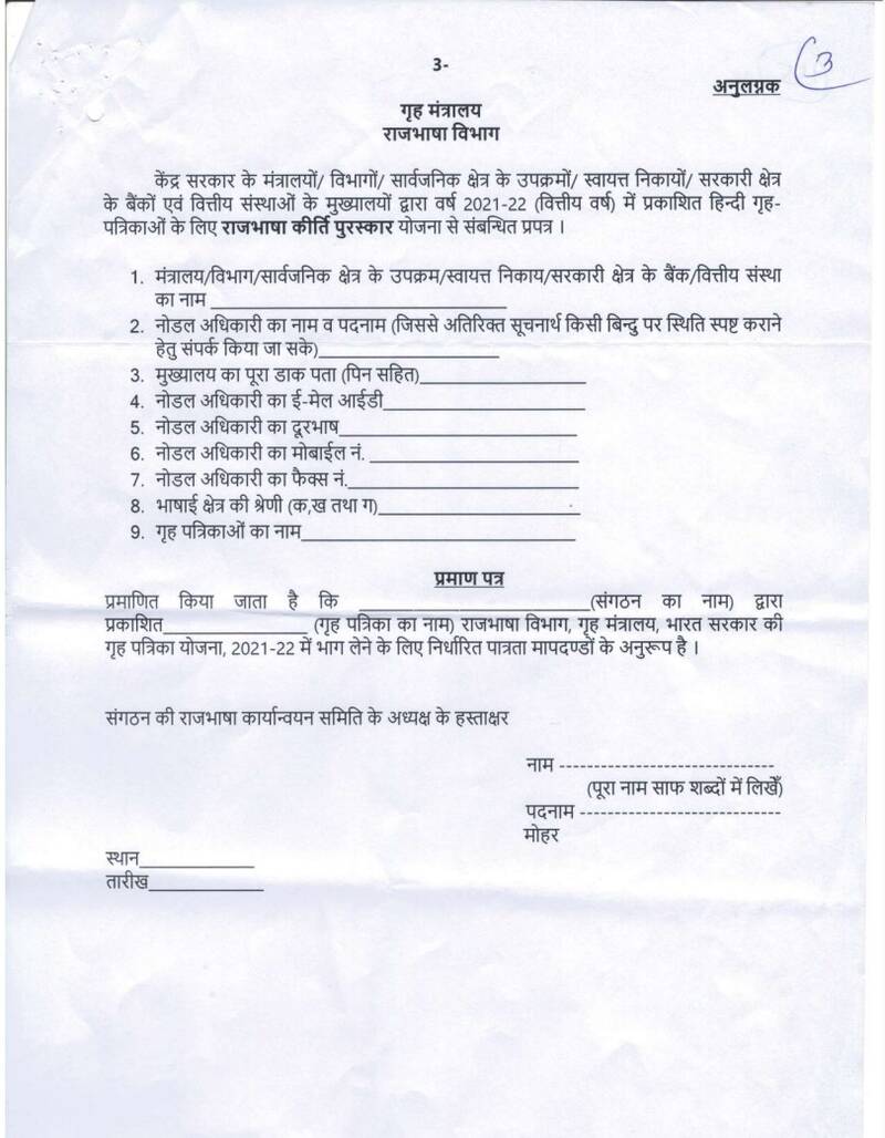 5 ऐसे समस्त मंत्रालय/ विभाग/ सार्वजनिक क्षेत्र के उपक्रम/ स्वायत्त निकाय/ सरकारी क्षेत्र के बैंक और वित्तीय संस्थाओं के मुख्यालय, जो इस पुरस्कार के लिए प्रार्थना पत्र देने के इच्छुक है तथा पैरा 03 में उल्लिखित आता की न्यूनतम शर्ते पूरी करते हैं, दिनांक 01/04/2021 से 31/03/2022 के बीच की अवधि में प्रकाशित अथवा राजभाषा विभाग की वेबसाइट पर उपलब्ध लिंक ‘ई-पत्रिका पुस्तकालय’ पर अपलोडेड गृह पत्रिका के श्रेष्ठ दो अंको की 5-5 प्रतियों के साथ संलग्न प्रपत्र (अनुलग्नक) में वांछित सूचना पूर्ण व स्पष्ट रूप से भर कर अंतिम तिथि 31 मई, 2022 तक राजभाषा विभाग को भेजने की कृपा करें |