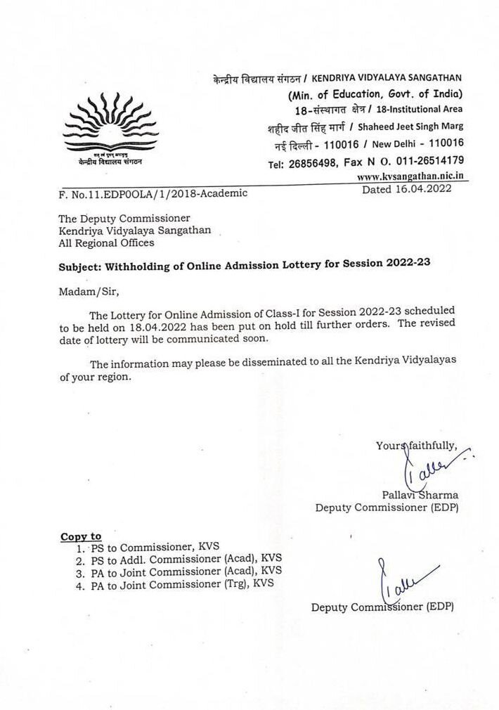 Withholding of Online Admission Lottery for Session 2022-23. Kendriya Vidyalaya Sangathan has issued letter to withhold lottery for online admission scheduled to be held on 18.04.2022.